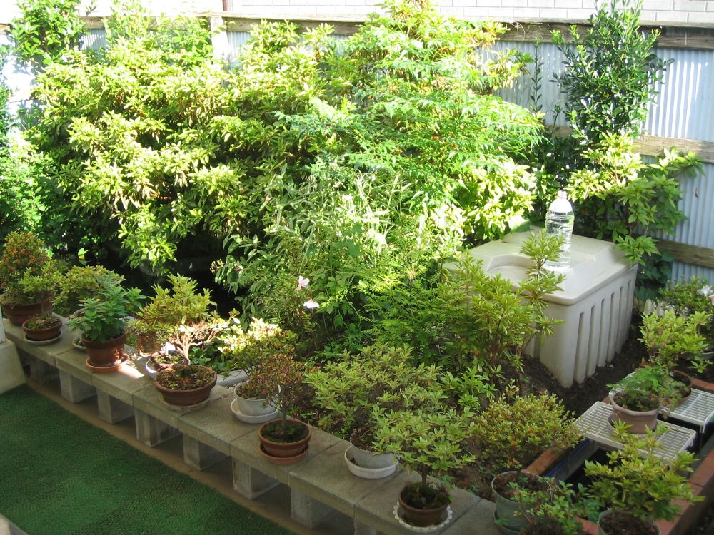 | | の上は雨戸の戸袋に二段式の棚を直付けとし、塀の一方は水槽用の金属製台が2台あるので並べる方法 |